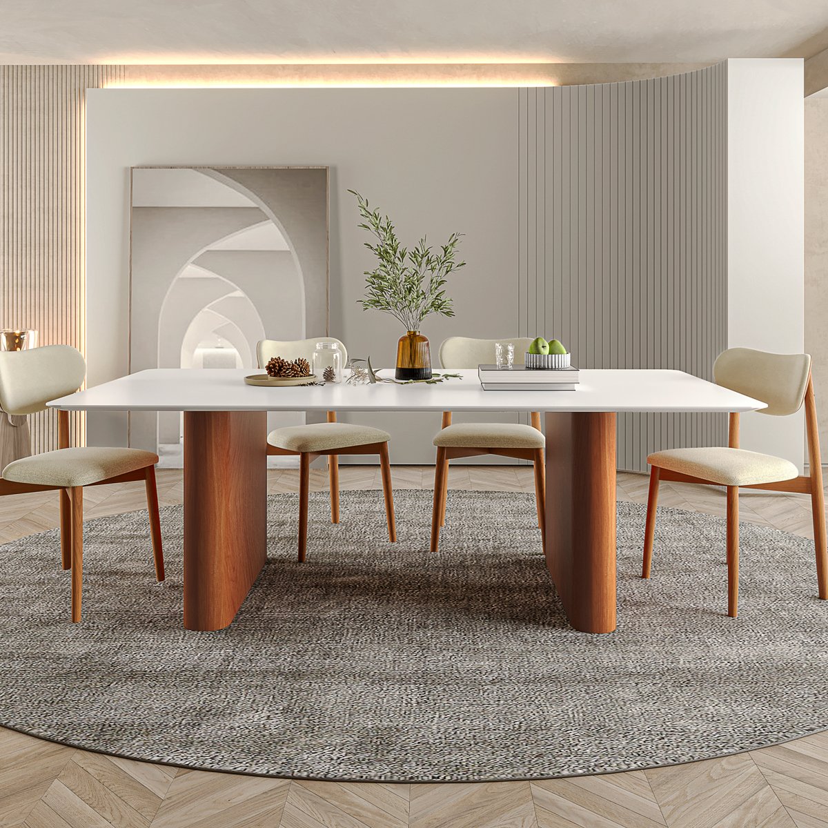 - Tapetes: delimite a área de refeições com tapetes de fibras naturais ou sintéticas, mantendo pés das cadeiras livres de atrito.